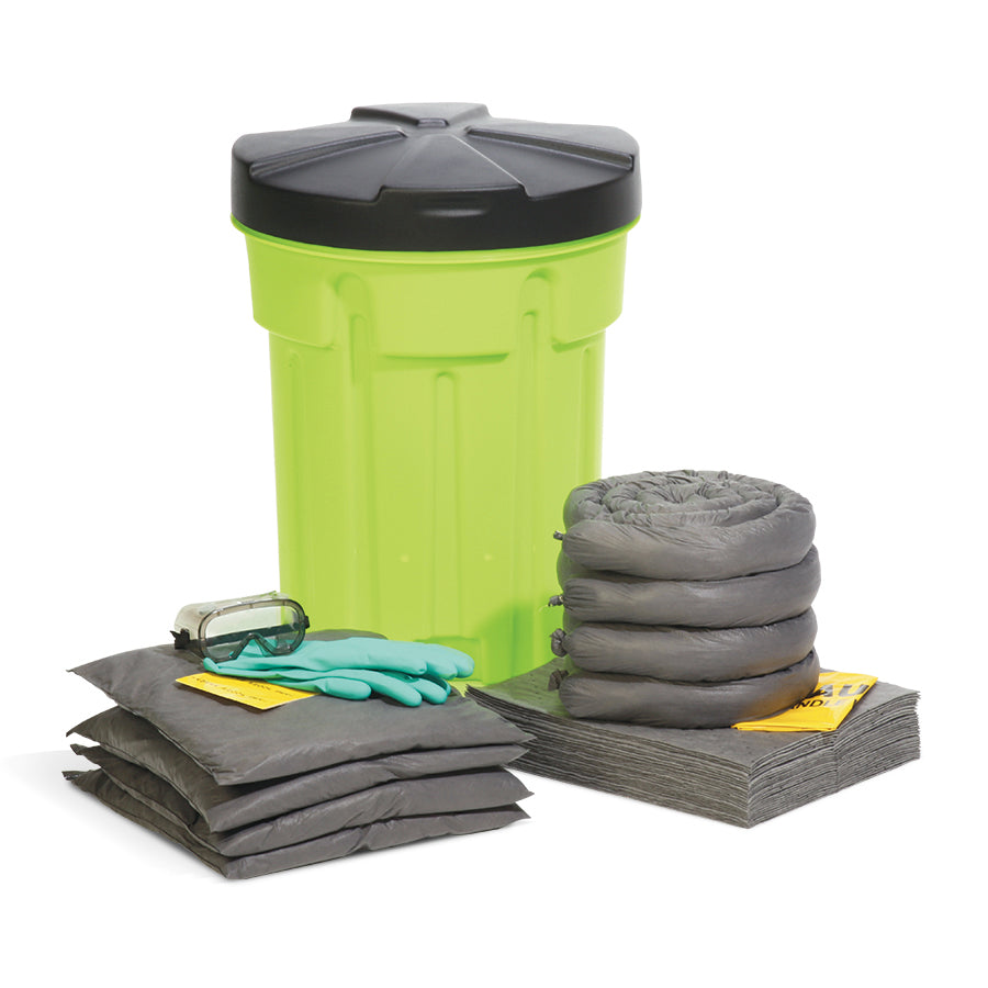 Kit Contents: Includes: 25 - 15” x 19” Gray Universal HeavyWeight SonicBonded Pads • 4 - 3" X 8' Gray Universal Sorbent Socks • 4 - 18" x 18" Gray Universal Sorbent Pillows • 1 - Emergency Response GuideBook • 5 - 18" X 30" Yellow Disposal Bags & Ties • 1 - Pair Nitrile Gloves • 1 - Safety Goggles • 1 - 3” x 5” Vinyl Spill Kit Label • 6 - 6" x 2" TamperProof Seals • 1 - 23" x 30" Hi-Viz 30-Gallon Overpack