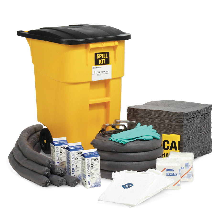 Kit Contents: Includes: 100 - 15” x 19” Gray Universal HeavyWeight Defender Pads • 6 - 3" X 4' Gray Universal Sorbent Socks • 4 - 3" x 12' Gray Universal Sorbent Socks • 1 - Emergency Response GuideBook • 4 - 30" X 60" Yellow Disposal Bags & Ties • 2 - Pair Nitrile Gloves • 2 - Safety Goggles • 2 - Coveralls • 1 - 29" X 23.5" X 36.75: Yellow 50-Gallon Wheeled Container • 1 - 3” x 5” Vinyl Spill Kit Label • 6 - 6" x 2" TamperProof Seals • 3 - 28oz Shaker SuperSorb • 4 - 25/pkg Wipers
