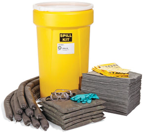 Kit Contents: Includes: 100 - 15" x 19" Gray Universal HeavyWeight SonicBonded Pads • 10 - 3" X 4' Gray Universal Sorbent Socks • 5 - 18" x 18" Gray Universal Sorbent Pillows • 2 - Pair Nitrile Gloves • 2 - Pair Goggles • 1 - Emergency Guide Book • 4 - 30" x 6" x 60" Yellow Disposal Bags & Ties • 6 - 6" x 2" Tamper Proof Seals • 1 - 24" X 40" Yellow 55-Gallon Drum (1H2/X100/S)