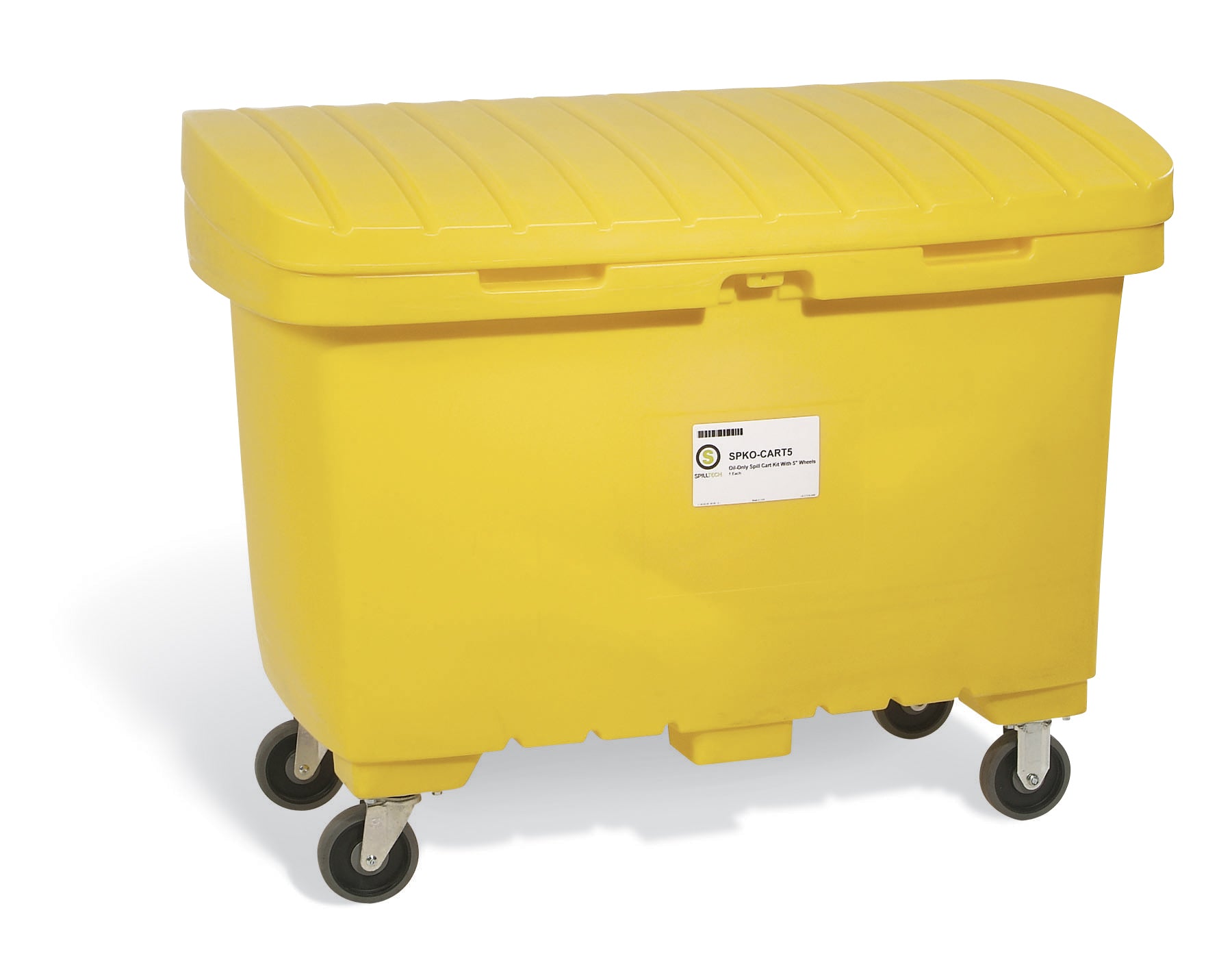 - Easy-to-locate, bright yellow wheeled container rolls quickly to a spill site; fits easily through doorways and aisles. Can also be moved with a forklift